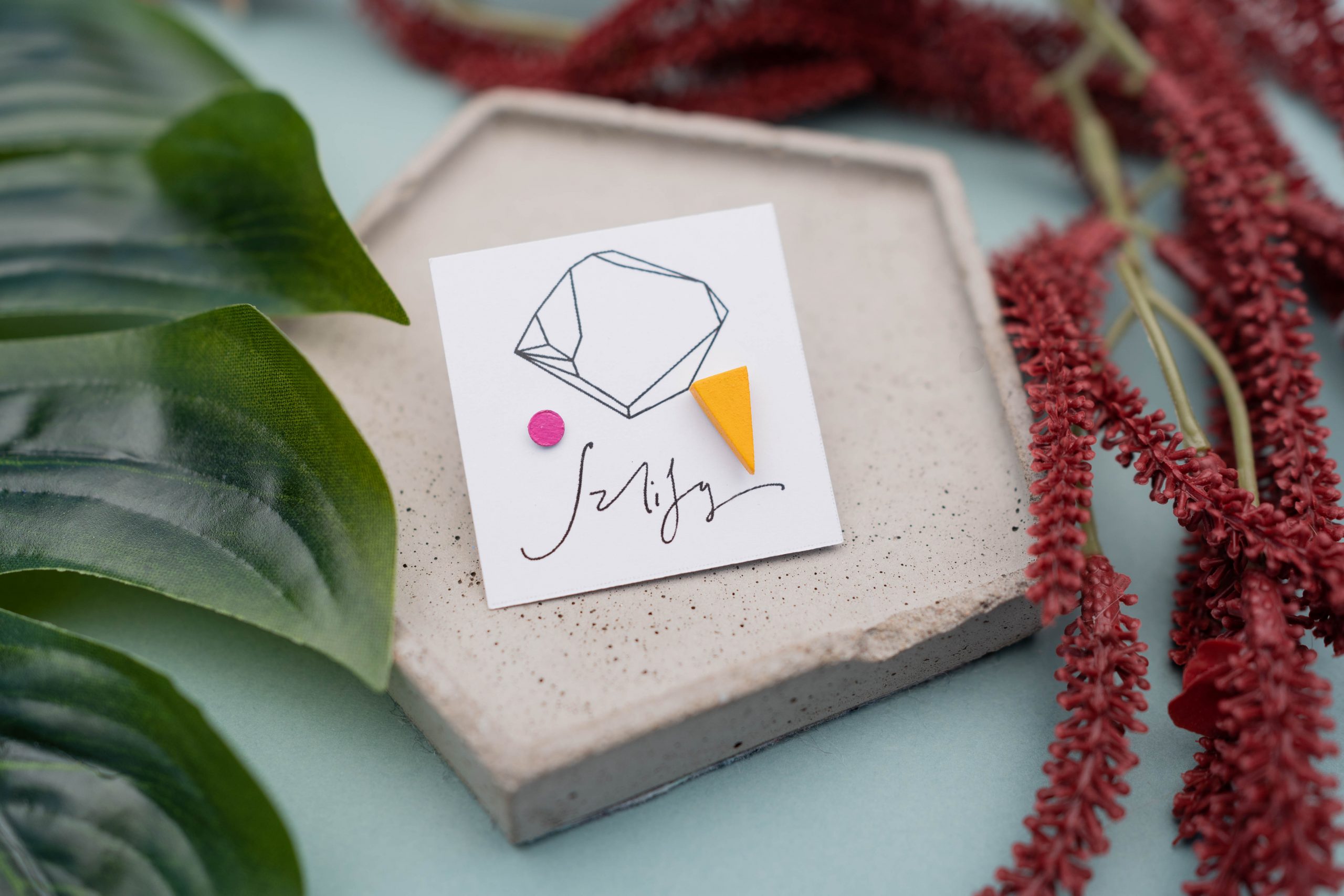Kolczyki drewniane, ręcznie malowane. Sztyft i zatyczki ze stali chirurgicznej. Wielkość 4mm, 6x11mm