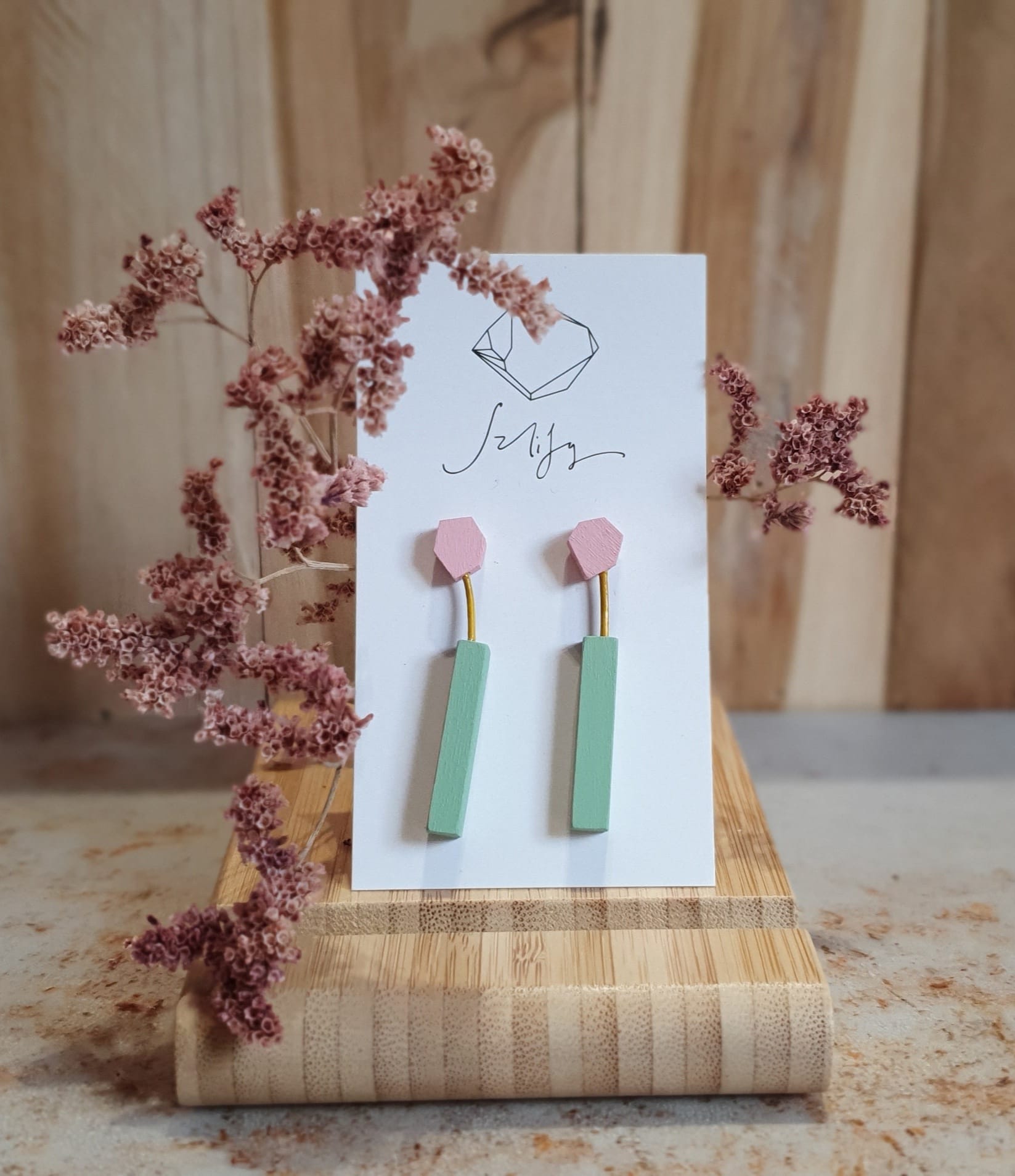 Kolczyki drewniane, wiszące, ręcznie malowane. Sztyft i zatyczki ze stali chirurgicznej. Wielkość długość 4,5 cm  szerokość 0,5 cm
