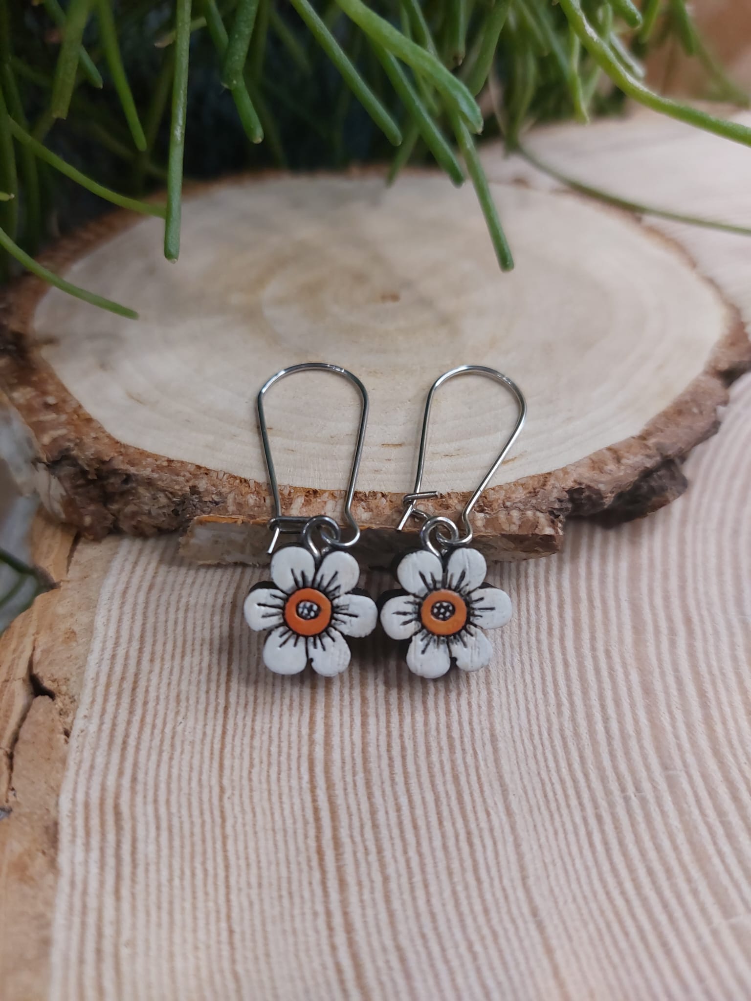 Kolczyki drewniane, ręcznie malowane. Bigle ze stali chirurgicznej.